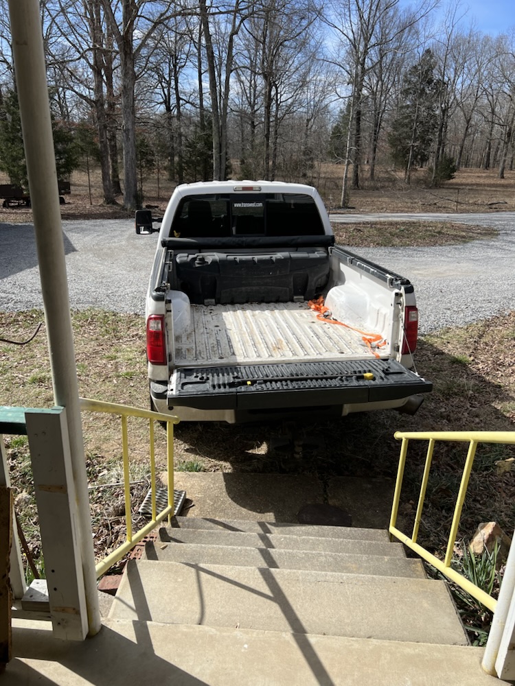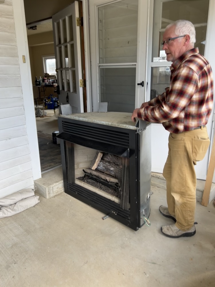 We found a used gas fireplace to put in the house. I was so busy helping Mark unload it that I didn’t get pictures of it sitting in the truck bed. We used 2×4’s and poles and rolled this big fireplace out of the back of the truck onto the porch then back up into the house.