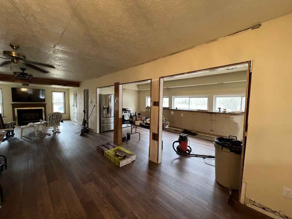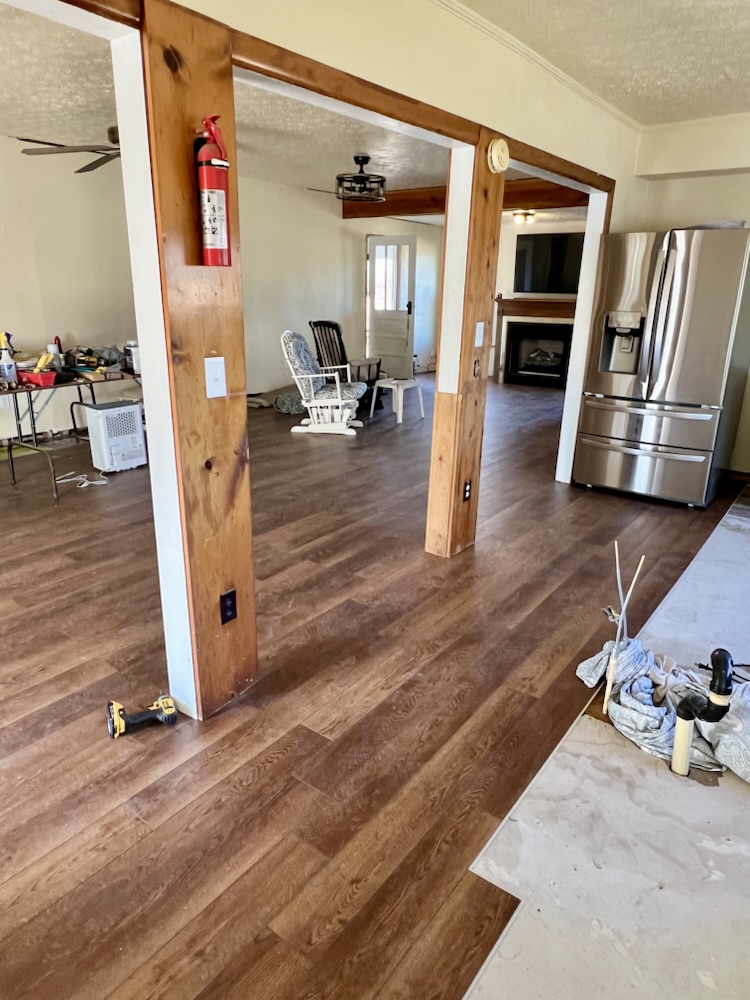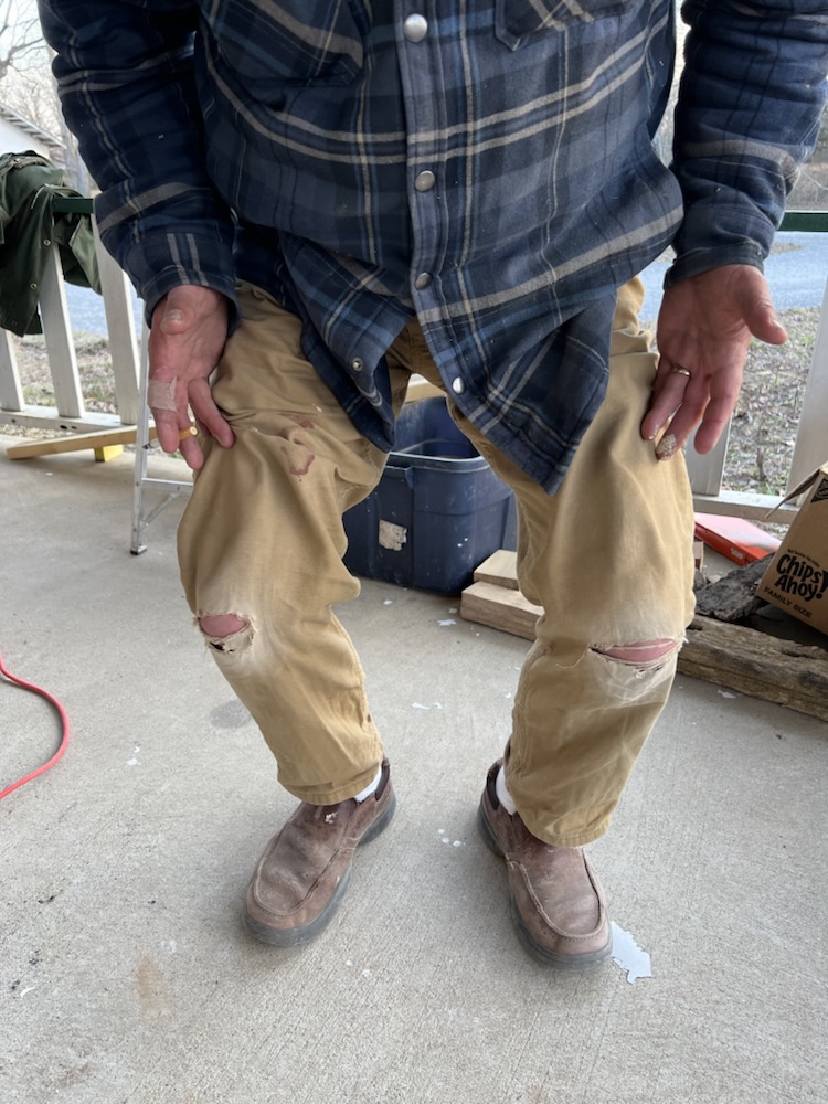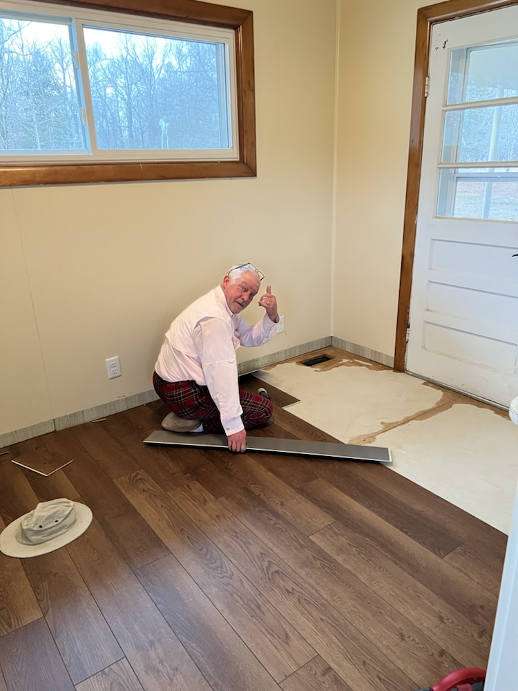The flooring is done! Poor Mark worked so hard that he wore holes in his knees in his new pair of carhartt work pants. 😂