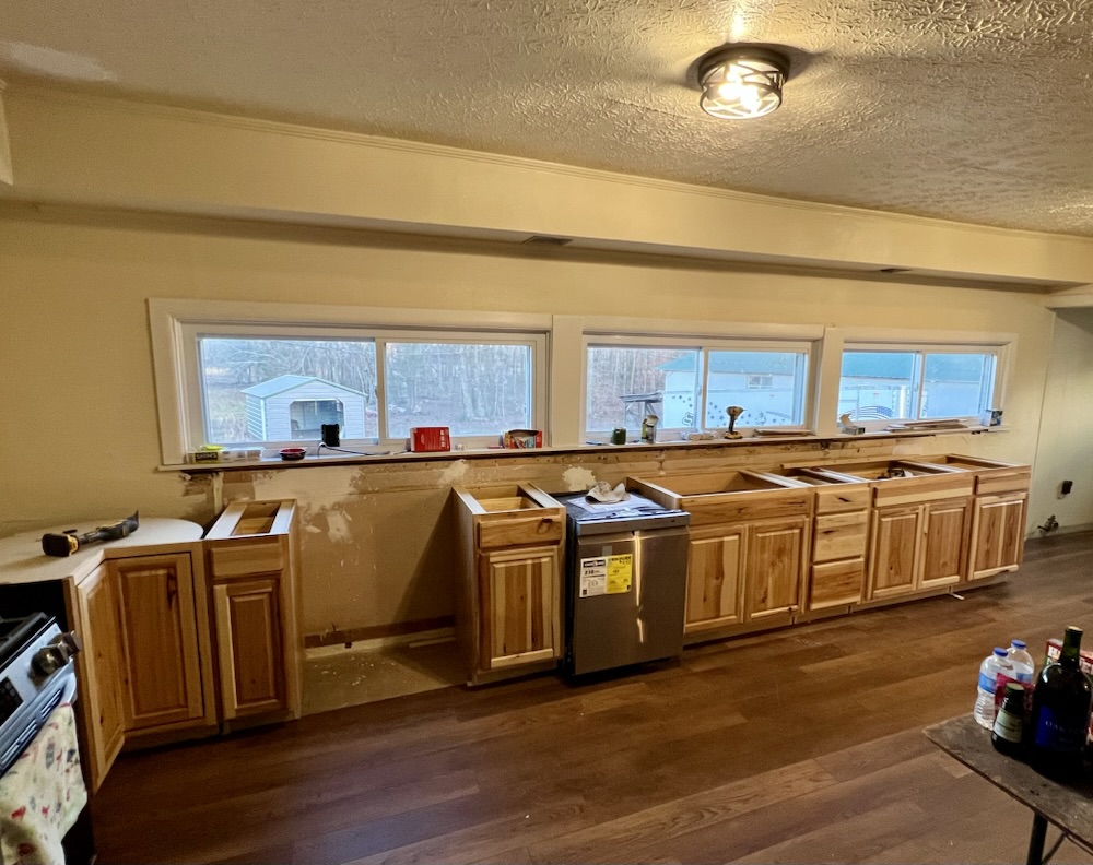 Mark worked on kitchen cabinets. We chose the same cabinets that we put in our Yurt in Washington from Lowes. We found out in the last couple days how the workmanship has changed over the six years. We had to return at least four cabinets due to breakage and damage.