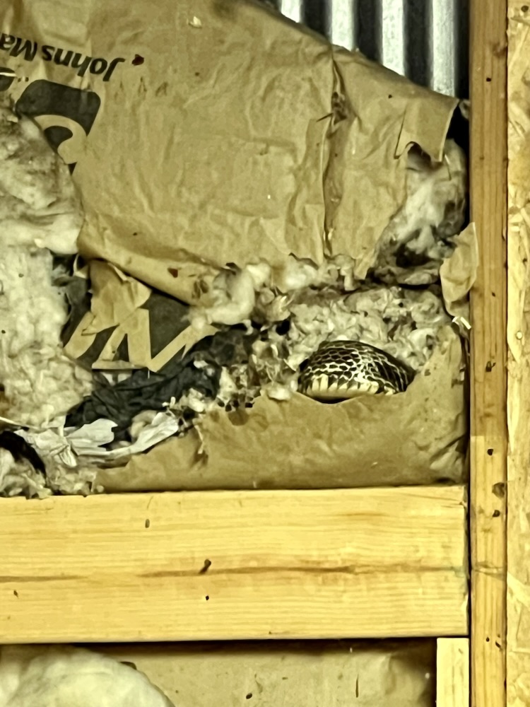 Now that we are done with the fun stuff, moving back to the beginning of last week. Mark was sitting out on the front porch and he heard a noise in the corner of the shop. He thought he heard a mouse squealing. Of course, his first thought was a snake and yes, he was right. I am pretty sure this is the snake that killed one of my baby chicks that got out of the pen in the shop. Unfortunately, this is a good snake to have around because it does kill rodents. This thing was huge.
