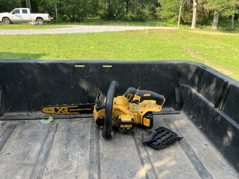 Of course I had to have a little oopsie. I got so excited that he was here delivering the trailer that I forgot to move my chainsaw that was under all those branches and the poor gentleman ran over it.