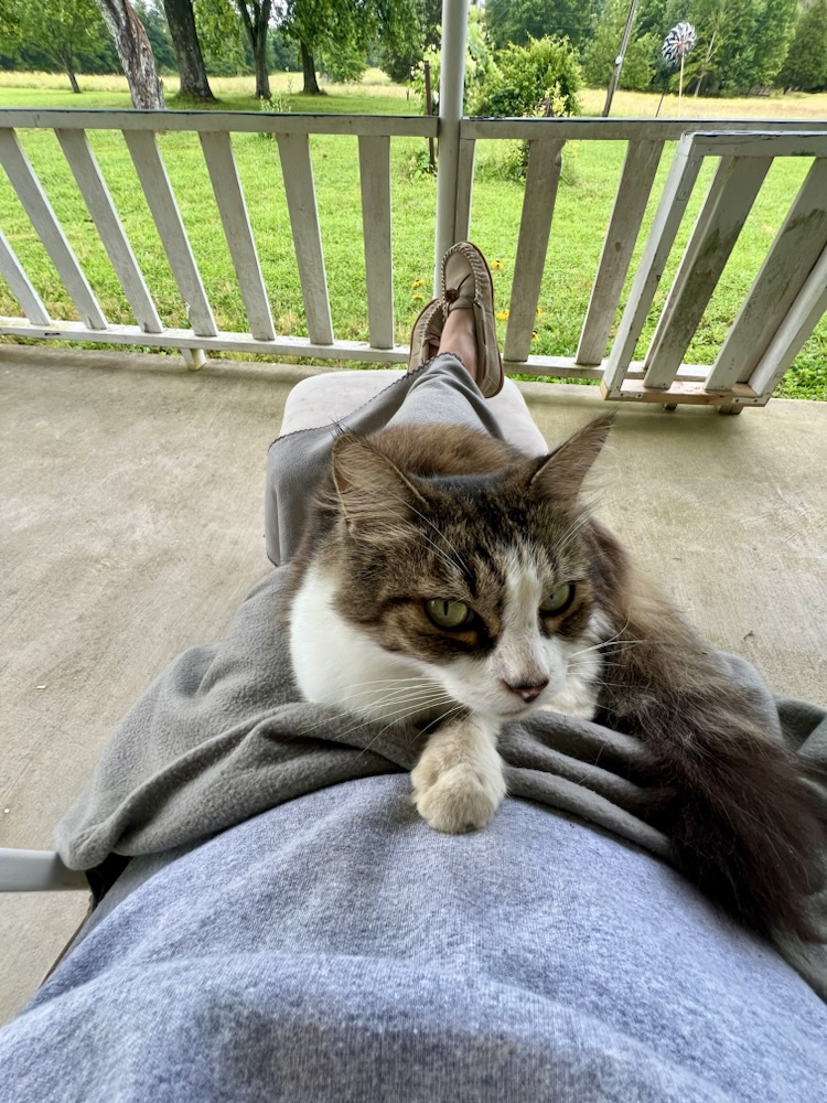 Daisy and I are enjoying some snuggle time out on the back porch, listening to the soft rain. She gets so darn skinny during the summer months because she wants to be outside hunting all the time.