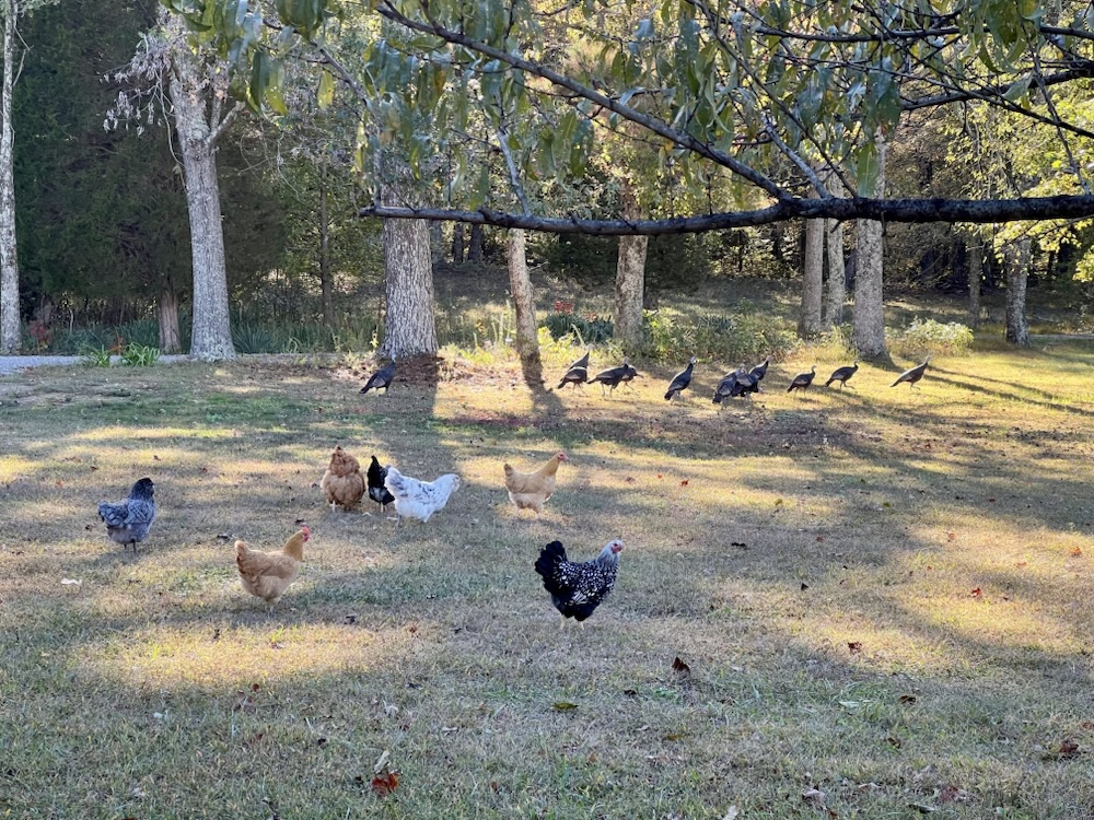 We have been enjoying our cool fall weather. π Yesterday the wild turkeys were enjoying themselves hanging out with the chickens.