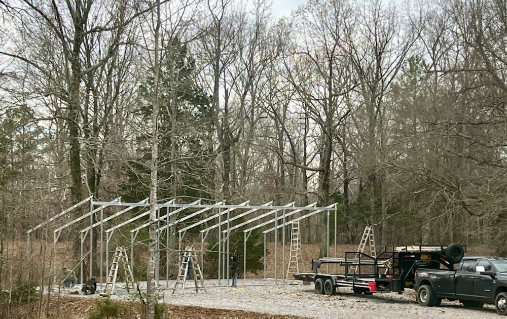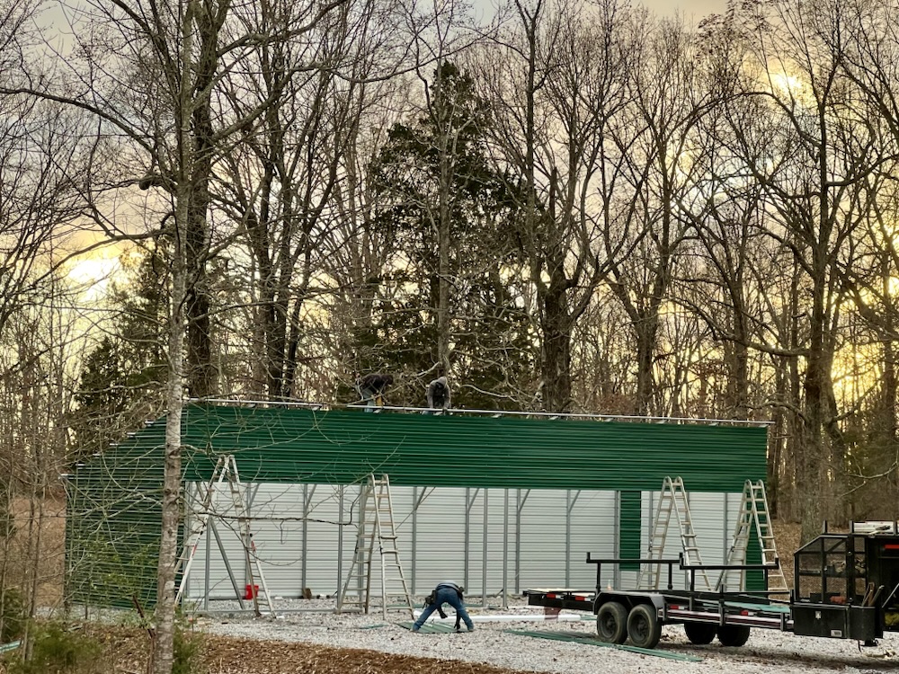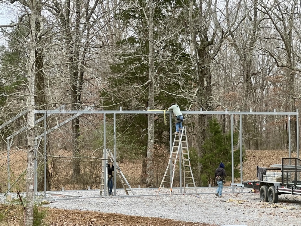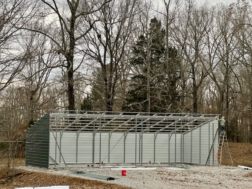 We got our new vehicle building done yesterday and today! Later we are able to put rolling doors on the openings. It was so windy yesterday it made me nervous with those men handling those big metal sheets. They worked on this building until 8:00 last night with their headlamps on.
